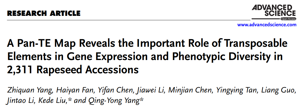 近日,我校皇冠集团网站与华中农业大学、崖州湾国家实验室等多单位联合在国际知名期刊Advanced Science(IF5 year:15.6)杂志上在线发表题为A pan-TE map reveals the important role of transposable elements in gene expression and phenotypic diversity in 2,311 rapeseed accessions的研究论文。该研究通过整合14个生态型代表性的油菜高质量基因组与来自全球2,311份油菜种质资源的大规模多组学数据,从基因组非编码区域的角度,全面系统地刻画了油菜转座子的组成、分布和变异规律,构建了全球首张油菜“泛转座子图谱”(pan-TE map),并深入揭示转座子在调控基因表达、驱动表型变异以及促进育种改良中的核心作用,为作物分子设计育种提供了全新的资源体系和理论基础。我校皇冠集团网站樊海燕博士为共同第一作者,植物营养与逆境生物学团队负责人李金涛副教授也参与了该研究工作。