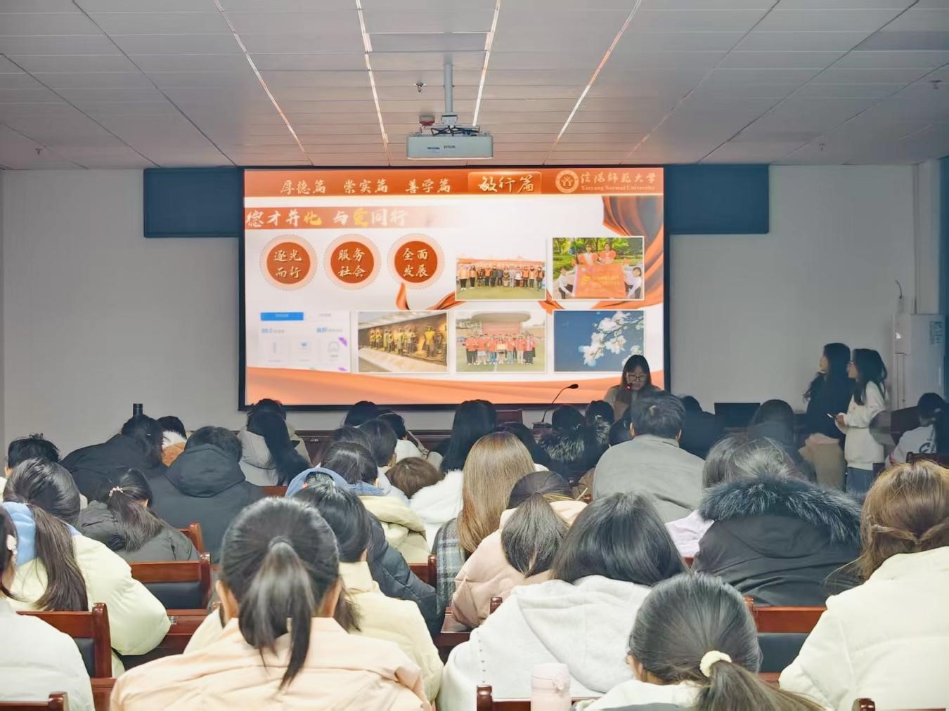 本次宣讲会首先由化学化工学院石慧鑫进行宣讲,她以化茧为蝶 奋楫笃行为核心,从立心铸魂、研精覃思、勤学善思、躬行实践四个维度,结合团日活动参与记录、省级科研竞赛获奖实验笔记、社区科普志愿服务照片等素材,阐释厚德崇实,善学敏行的校训内涵。