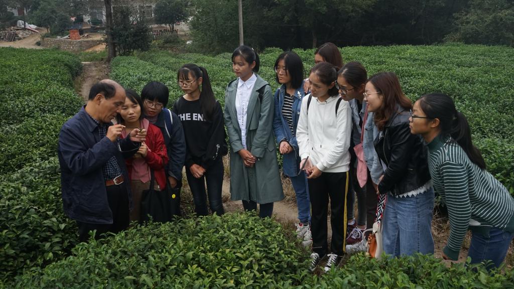 10月13日,2019级茶学本科班9名大学生,在班长姜慧敏、团支书张品芝和学习委员张雯雯的组织下,邀请我校茶树生物学省级重点实验室主任江昌俊教授担任茶园实践教学教师,去往信阳市浉河区浉河港镇、董家河镇的四望山茶场、黄龙寺茶场、瞭望台茶场、广义茶场开展课外实践教学,辅导员杨霁虹、朱晓雯参加。